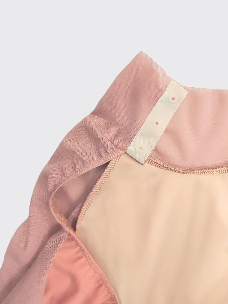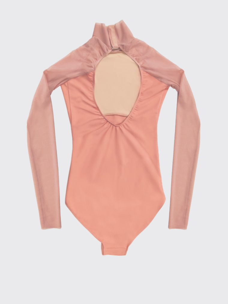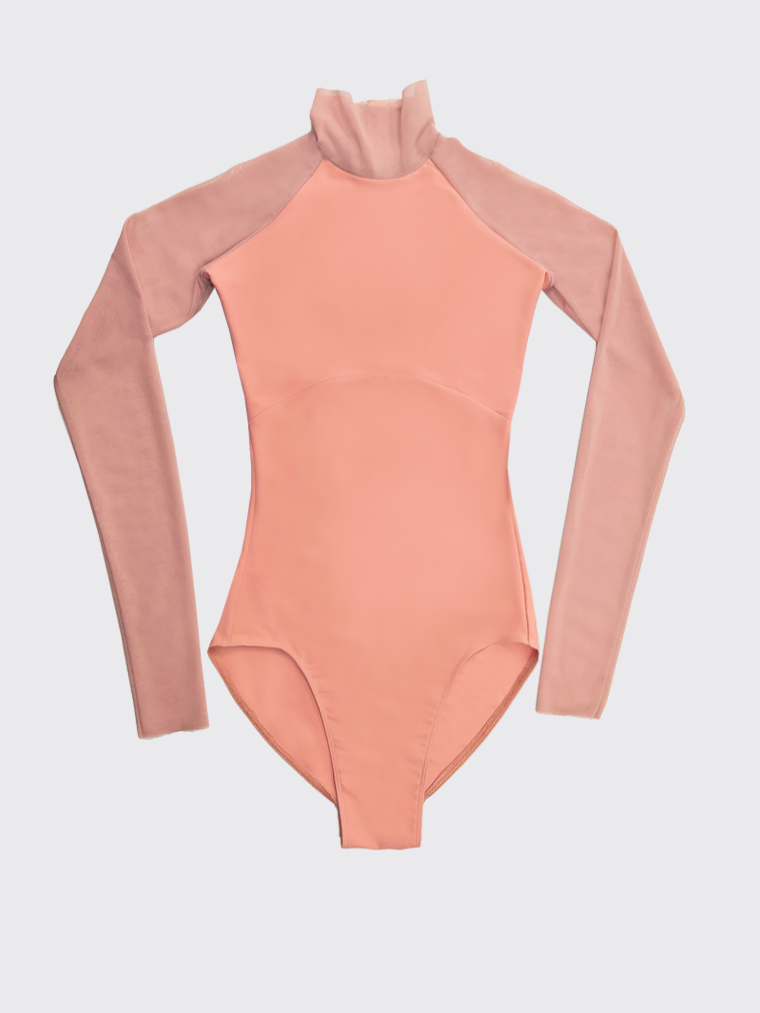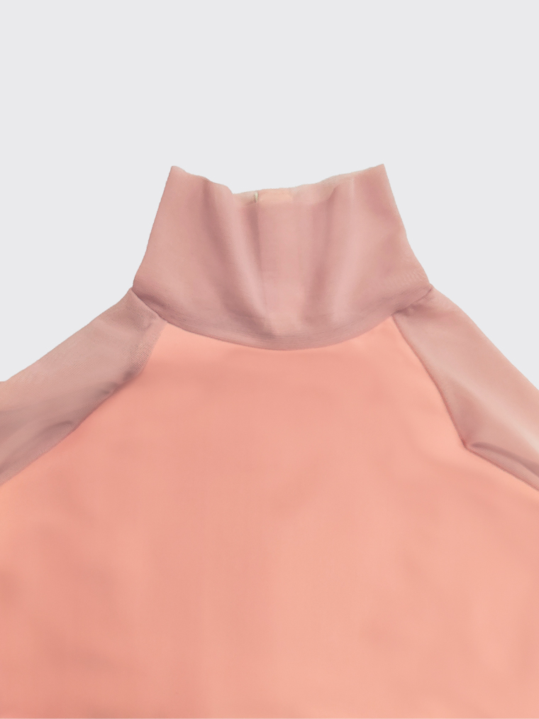 Developing and improving the Galaxy leotard model, so beloved by many, we created Galatea and included it in the spring drop AWAKENING OF FLORA. Leaving aside the key elements – a spectacular neckline on the back, raglan sleeves and a strict stand-up collar, we played with combinations of materials. And we chose a very spring and popular colour for this edition – a dusty peach.